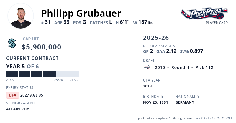 Philipp Grubauer is signed to a 6 year, $35,400,000 contract with a cap hit of $5,900,000 per season, playing for the Seattle Kraken. His contract expires at the end of the 2026-27 season, making Grubauer an Unrestricted Free Agent.