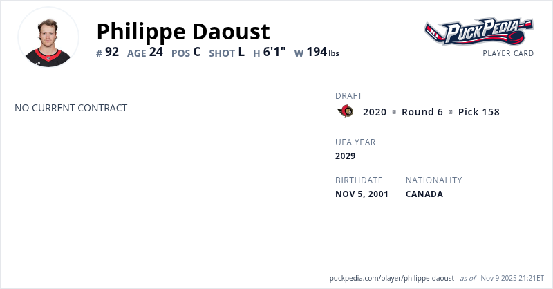Philippe Daoust is an Unrestricted Free Agent (No Qualifying Offer). His last contract was 3 years, $2,465,001 with a cap hit of $821,667 per season. It expired at the end of the 2024-25 season.