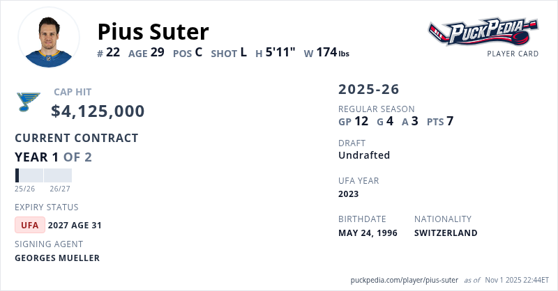 Pius Suter is signed to a 2 year, $8,250,000 contract with a cap hit of $4,125,000 per season, playing for the St. Louis Blues. His contract expires at the end of the 2026-27 season, making Suter an Unrestricted Free Agent.