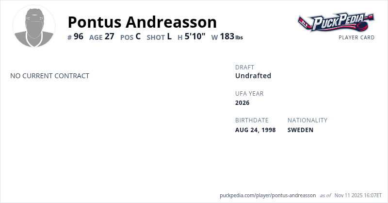 Pontus Andreasson is an Unrestricted Free Agent (No Qualifying Offer). His last contract was 1 year, $842,500 with a cap hit of $842,500 per season. It expired at the end of the 2022-23 season.