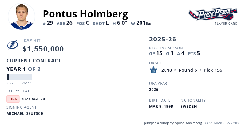 Pontus Holmberg is signed to a 2 year, $3,100,000 contract with a cap hit of $1,550,000 per season, playing for the Tampa Bay Lightning. His contract expires at the end of the 2026-27 season, making Holmberg an Unrestricted Free Agent.