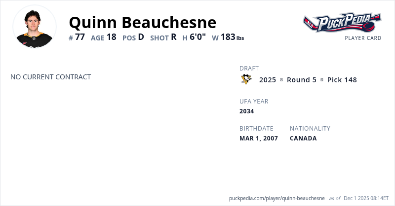 | 2023-24 | 16 | OHL | Guelph Storm | 33 | 2 | 5 | 7 | 28 | Playoffs | 4 | 0 | 0 | 0 | 0 | ||||||||||||||||