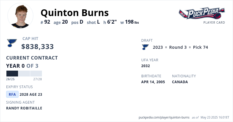 Quinton Burns is signed to a 3 year, $2,514,999 contract with a cap hit of $838,333 per season, playing for the St. Louis Blues. His contract expires at the end of the 2027-28 season, making Burns a Restricted Free Agent.