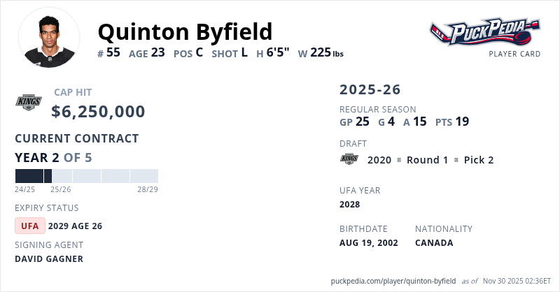 Quinton Byfield is signed to a 5 year, $31,250,000 contract with a cap hit of $6,250,000 per season, playing for the Los Angeles Kings. His contract expires at the end of the 2028-29 season, making Byfield an Unrestricted Free Agent.