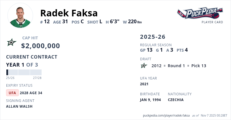 Radek Faksa is signed to a 3 year, $6,000,000 contract with a cap hit of $2,000,000 per season, playing for the Dallas Stars. His contract expires at the end of the 2027-28 season, making Faksa an Unrestricted Free Agent.