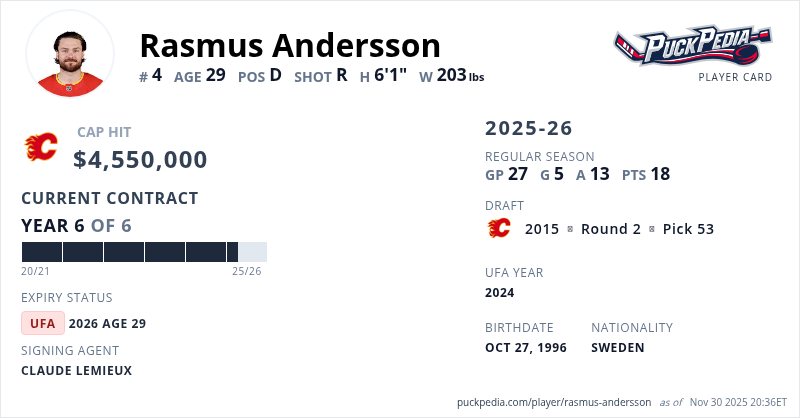 Rasmus Andersson is signed to a 6 year, $27,300,000 contract with a cap hit of $4,550,000 per season, playing for the Calgary Flames. His contract expires at the end of the 2025-26 season, making Andersson an Unrestricted Free Agent.