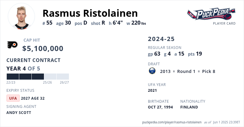 Rasmus Ristolainen is signed to a 5 year, $25,500,000 contract with a cap hit of $5,100,000 per season, playing for the Philadelphia Flyers. His contract expires at the end of the 2026-27 season, making Ristolainen an Unrestricted Free Agent.
