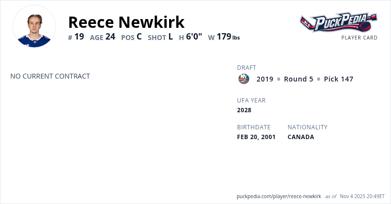 Reece Newkirk is an Unrestricted Free Agent (No Qualifying Offer). His last contract was 3 years, $2,484,999 with a cap hit of $828,333 per season. It expired at the end of the 2023-24 season.