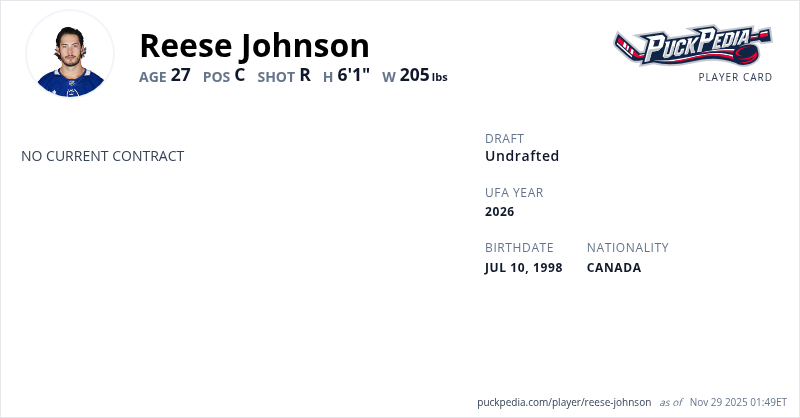 Reese Johnson is an Unrestricted Free Agent (No Qualifying Offer). His last contract was 1 year, $775,000 with a cap hit of $775,000 per season. It expired at the end of the 2024-25 season.