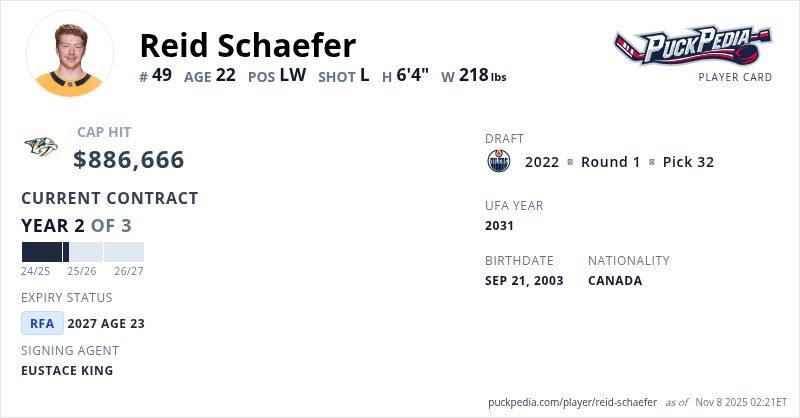 Reid Schaefer is signed to a 3 year, $2,659,998 contract with a cap hit of $886,666 per season, playing for the Nashville Predators. His contract expires at the end of the 2026-27 season, making Schaefer a Restricted Free Agent.