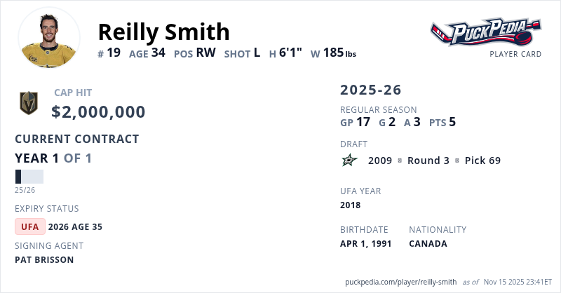 Reilly Smith is signed to a 1 year, $2,000,000 contract with a cap hit of $2,000,000 per season, playing for the Vegas Golden Knights. His contract expires at the end of the 2025-26 season, making Smith an Unrestricted Free Agent.