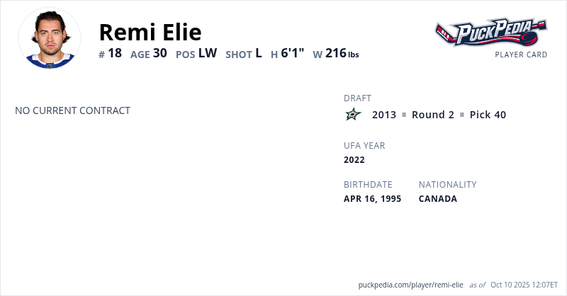 Remi Elie is an Unrestricted Free Agent. His last contract was 1 year, $750,000 with a cap hit of $750,000 per season. It expired at the end of the 2021-22 season.