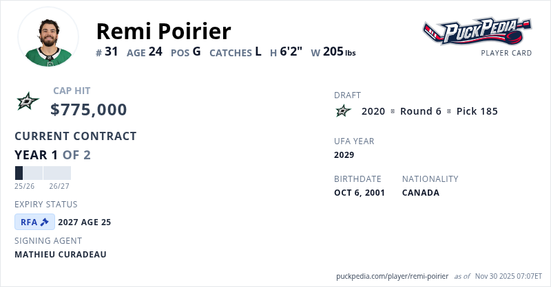 Remi Poirier is signed to a 2 year, $1,550,000 contract with a cap hit of $775,000 per season, playing for the Dallas Stars. His contract expires at the end of the 2026-27 season, making Poirier a Restricted Free Agent.