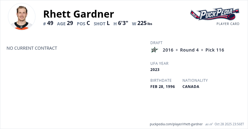 Rhett Gardner is an Unrestricted Free Agent. His last contract was 2 years, $1,550,000 with a cap hit of $775,000 per season. It expired at the end of the 2024-25 season.