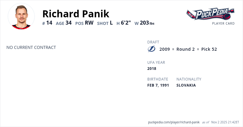 Richard Panik is an Unrestricted Free Agent. His last contract was 4 years, $11,000,000 with a cap hit of $2,750,000 per season. It expired at the end of the 2022-23 season.
