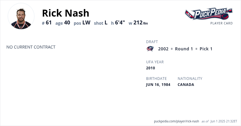 Rick Nash is an Unrestricted Free Agent. His last contract was 8 years, $62,400,000 with a cap hit of $7,800,000 per season. It expired at the end of the 2017-18 season.