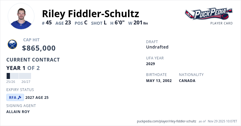 Riley Fiddler-Schultz is signed to a 2 year, $1,730,000 contract with a cap hit of $865,000 per season, playing for the Buffalo Sabres. His contract expires at the end of the 2026-27 season, making Fiddler-Schultz a Restricted Free Agent.