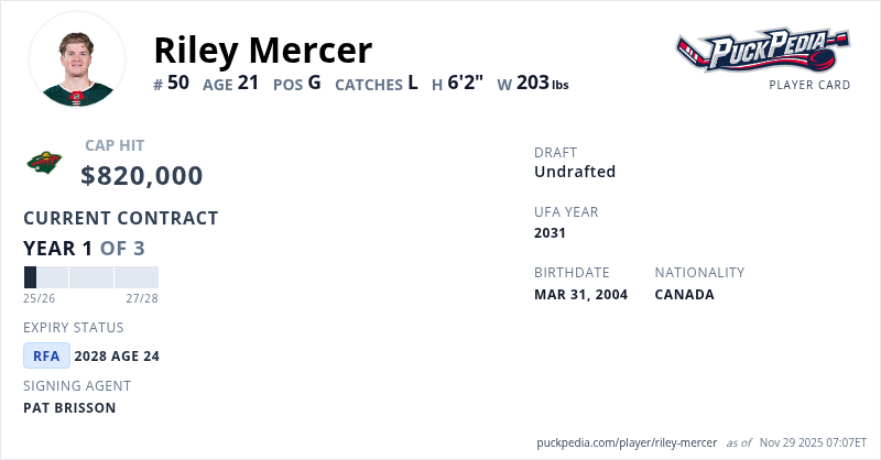 Riley Mercer is signed to a 3 year, $2,460,000 contract with a cap hit of $820,000 per season, playing for the Minnesota Wild. His contract expires at the end of the 2027-28 season, making Mercer a Restricted Free Agent.