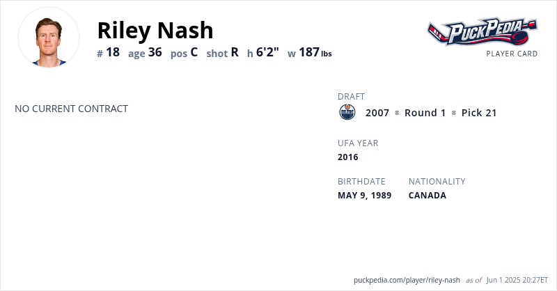 Riley Nash is an Unrestricted Free Agent. His last contract was 2 years, $1,550,000 with a cap hit of $775,000 per season. It expired at the end of the 2024-25 season.