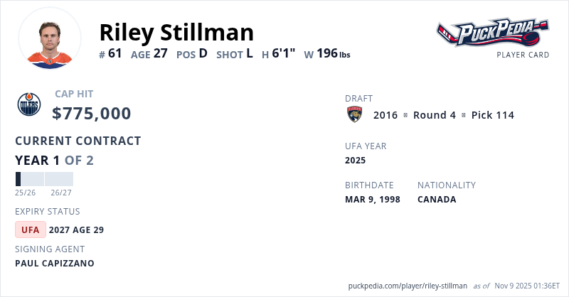 Riley Stillman is signed to a 2 year, $1,550,000 contract with a cap hit of $775,000 per season, playing for the Edmonton Oilers. His contract expires at the end of the 2026-27 season, making Stillman an Unrestricted Free Agent.