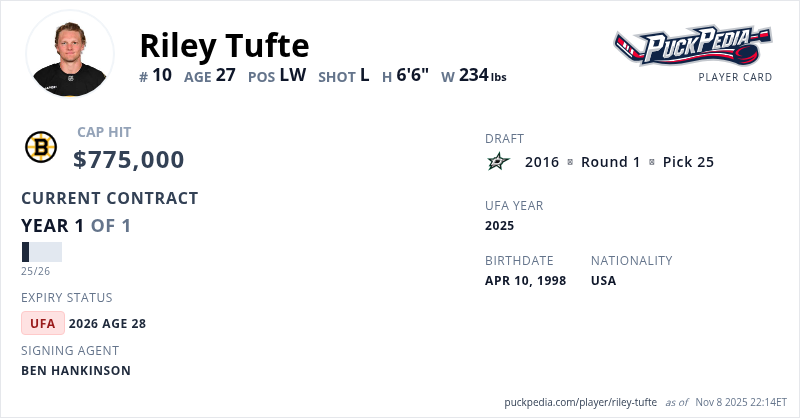 Riley Tufte is signed to a 1 year, $775,000 contract with a cap hit of $775,000 per season, playing for the Boston Bruins. His contract expires at the end of the 2025-26 season, making Tufte an Unrestricted Free Agent.