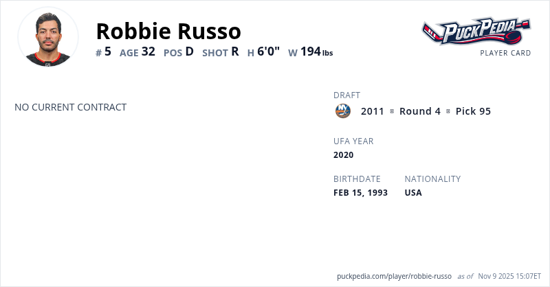 Robbie Russo is an Unrestricted Free Agent. His last contract was 2 years, $1,500,000 with a cap hit of $750,000 per season. It expired at the end of the 2022-23 season.