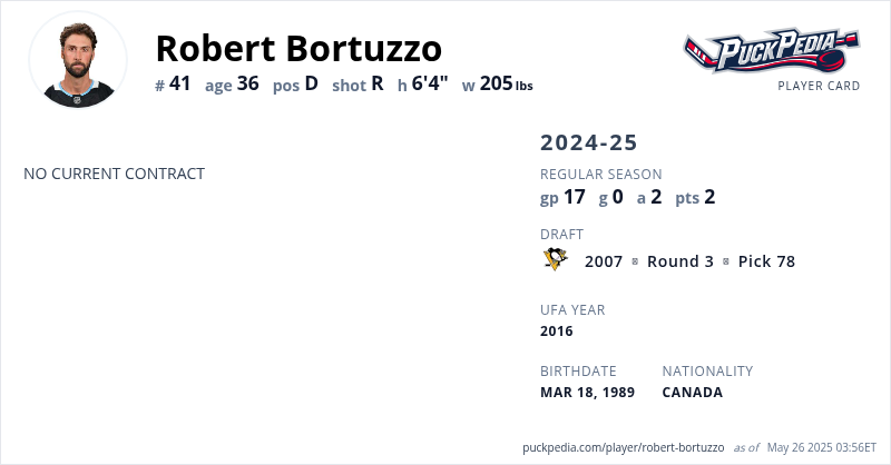 Robert Bortuzzo is an Unrestricted Free Agent. His last contract was 1 year, $775,000 with a cap hit of $775,000 per season. It expired at the end of the 2024-25 season.