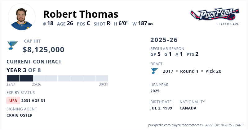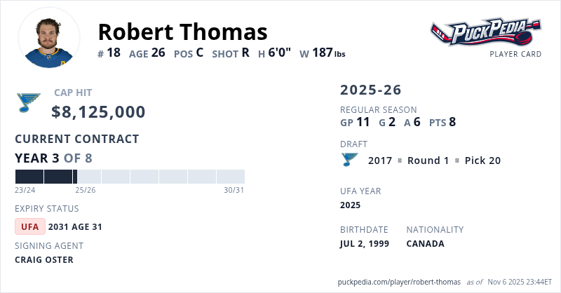 Robert Thomas is signed to a 8 year, $65,000,000 contract with a cap hit of $8,125,000 per season, playing for the St. Louis Blues. His contract expires at the end of the 2030-31 season, making Thomas an Unrestricted Free Agent.