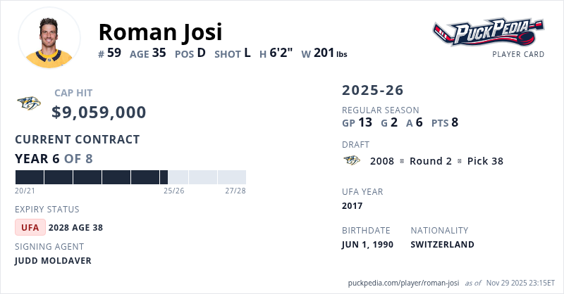 Roman Josi is signed to a 8 year, $72,472,000 contract with a cap hit of $9,059,000 per season, playing for the Nashville Predators. His contract expires at the end of the 2027-28 season, making Josi an Unrestricted Free Agent.