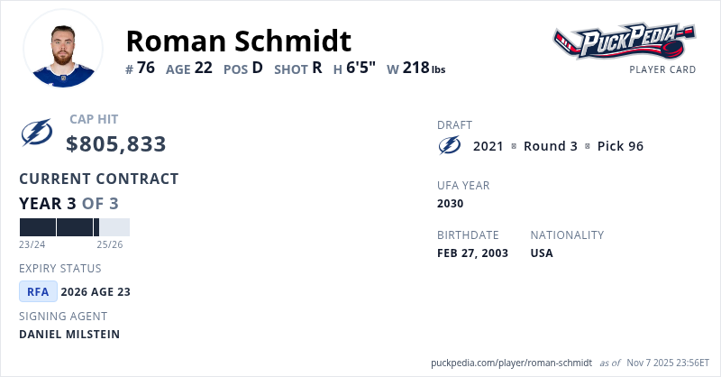 Roman Schmidt is signed to a 3 year, $2,417,499 contract with a cap hit of $805,833 per season, playing for the Tampa Bay Lightning. His contract expires at the end of the 2025-26 season, making Schmidt a Restricted Free Agent.