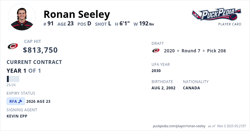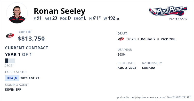Ronan Seeley is signed to a 1 year, $813,750 contract with a cap hit of $813,750 per season, playing for the Carolina Hurricanes. His contract expires at the end of the 2025-26 season, making Seeley a Restricted Free Agent.