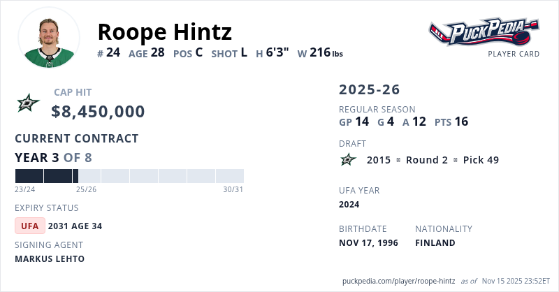 Roope Hintz is signed to a 8 year, $67,600,000 contract with a cap hit of $8,450,000 per season, playing for the Dallas Stars. His contract expires at the end of the 2030-31 season, making Hintz an Unrestricted Free Agent.