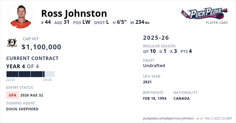 Ross Johnston is signed to a 4 year, $4,400,000 contract with a cap hit of $1,100,000 per season, playing for the Anaheim Ducks. His contract expires at the end of the 2025-26 season, making Johnston an Unrestricted Free Agent.