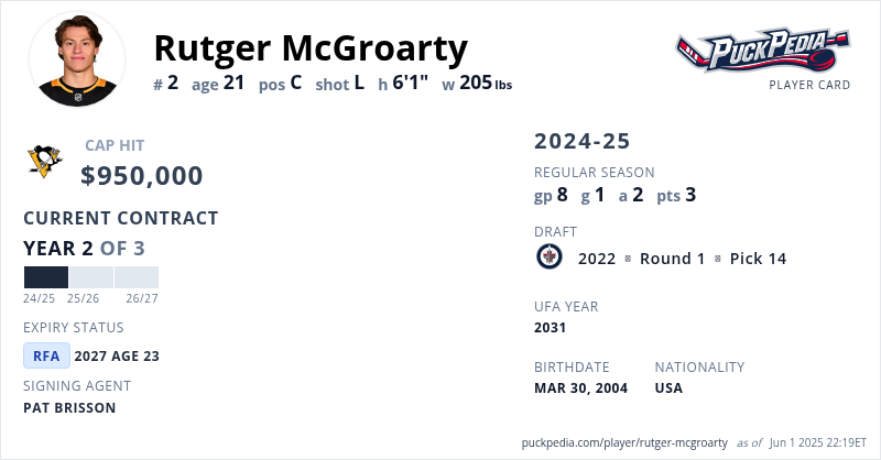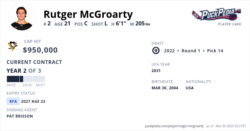 Rutger McGroarty is signed to a 3 year, $2,850,000 contract with a cap hit of $950,000 per season, playing for the Pittsburgh Penguins. His contract expires at the end of the 2026-27 season, making McGroarty a Restricted Free Agent.