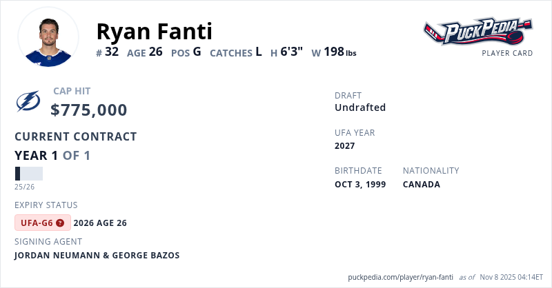 Ryan Fanti is signed to a 1 year, $775,000 contract with a cap hit of $775,000 per season, playing for the Tampa Bay Lightning. His contract expires at the end of the 2025-26 season, making Fanti an Unrestricted Free Agent (Group 6).