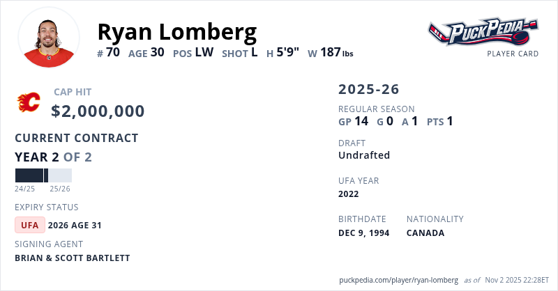 Ryan Lomberg is signed to a 2 year, $4,000,000 contract with a cap hit of $2,000,000 per season, playing for the Calgary Flames. His contract expires at the end of the 2025-26 season, making Lomberg an Unrestricted Free Agent.