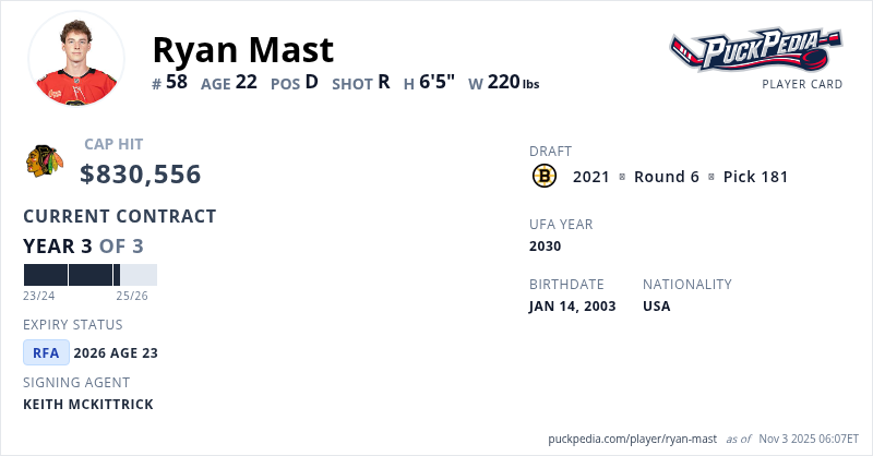 Ryan Mast is signed to a 3 year, $2,491,668 contract with a cap hit of $830,556 per season, playing for the Chicago Blackhawks. His contract expires at the end of the 2025-26 season, making Mast a Restricted Free Agent.