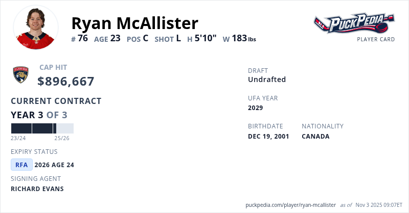 Ryan McAllister is signed to a 3 year, $2,690,001 contract with a cap hit of $896,667 per season, playing for the Florida Panthers. His contract expires at the end of the 2025-26 season, making McAllister a Restricted Free Agent.
