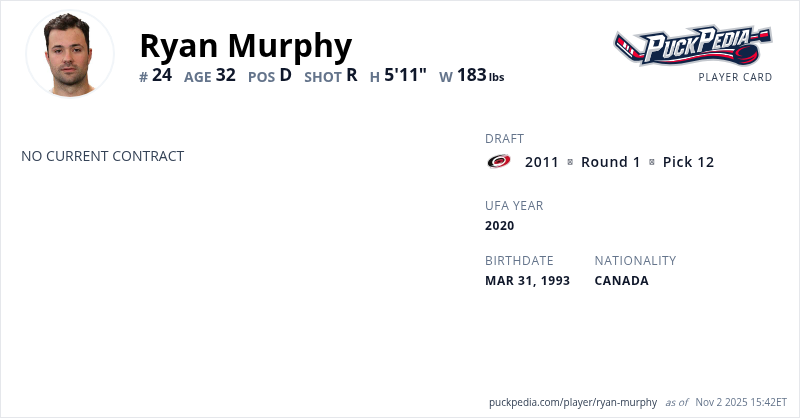 Ryan Murphy is an Unrestricted Free Agent. His last contract was 1 year, $800,000 with a cap hit of $800,000 per season. It expired at the end of the 2021-22 season.