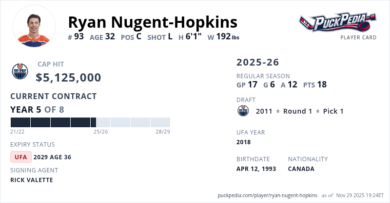 Ryan Nugent-Hopkins is signed to a 8 year, $41,000,000 contract with a cap hit of $5,125,000 per season, playing for the Edmonton Oilers. His contract expires at the end of the 2028-29 season, making Nugent-Hopkins an Unrestricted Free Agent.
