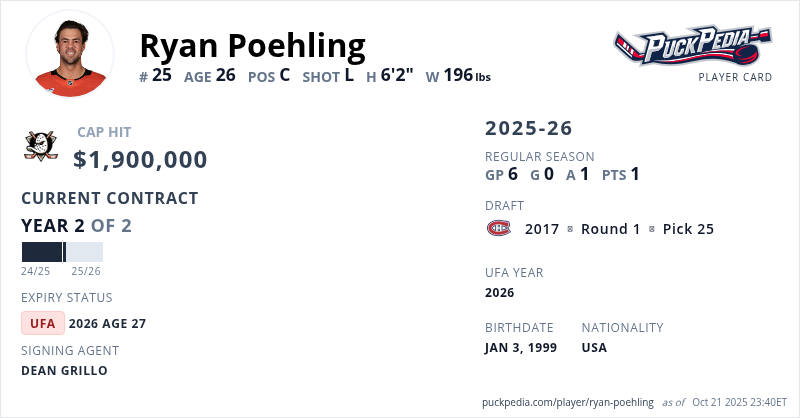 Ryan Poehling is signed to a 2 year, $3,800,000 contract with a cap hit of $1,900,000 per season, playing for the Anaheim Ducks. His contract expires at the end of the 2025-26 season, making Poehling an Unrestricted Free Agent.