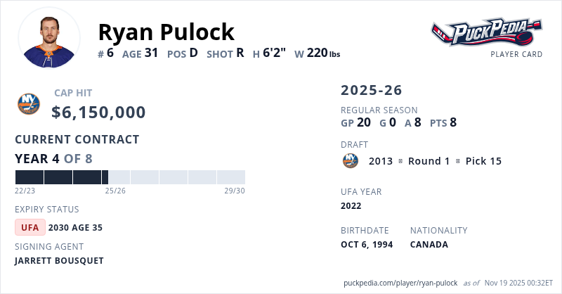 Ryan Pulock is signed to a 8 year, $49,200,000 contract with a cap hit of $6,150,000 per season, playing for the New York Islanders. His contract expires at the end of the 2029-30 season, making Pulock an Unrestricted Free Agent.