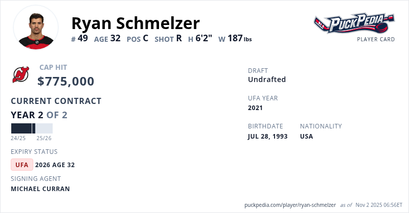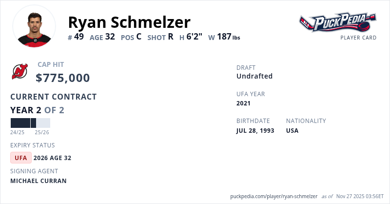Ryan Schmelzer is signed to a 2 year, $1,550,000 contract with a cap hit of $775,000 per season, playing for the New Jersey Devils. His contract expires at the end of the 2025-26 season, making Schmelzer an Unrestricted Free Agent.