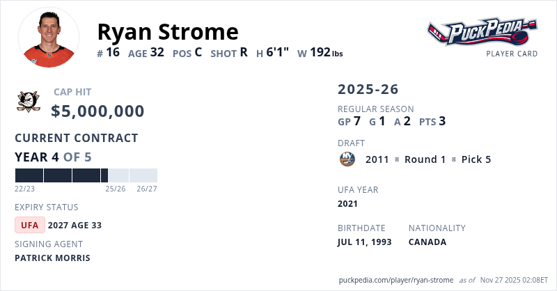Ryan Strome is signed to a 5 year, $25,000,000 contract with a cap hit of $5,000,000 per season, playing for the Anaheim Ducks. His contract expires at the end of the 2026-27 season, making Strome an Unrestricted Free Agent.