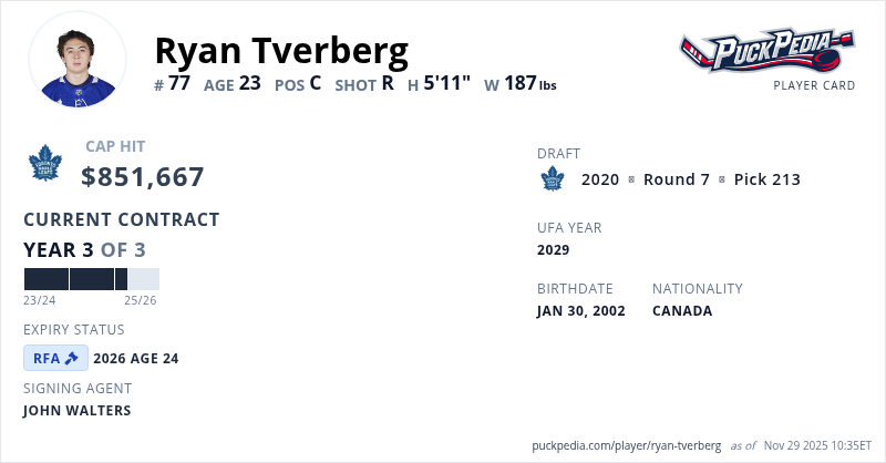 Ryan Tverberg is signed to a 3 year, $2,555,001 contract with a cap hit of $851,667 per season, playing for the Toronto Maple Leafs. His contract expires at the end of the 2025-26 season, making Tverberg a Restricted Free Agent.