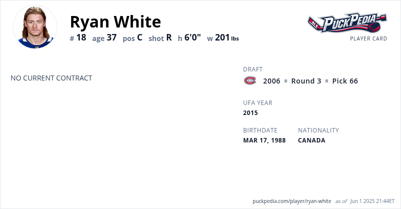 Ryan White is an Unrestricted Free Agent. His last contract was 1 year, $1,000,000 with a cap hit of $1,000,000 per season. It expired at the end of the 2016-17 season.