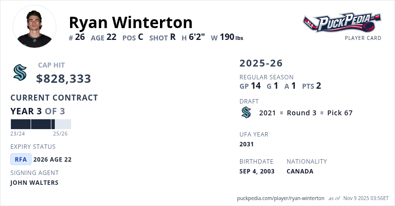 Ryan Winterton is signed to a 3 year, $2,484,999 contract with a cap hit of $828,333 per season, playing for the Seattle Kraken. His contract expires at the end of the 2025-26 season, making Winterton a Restricted Free Agent.