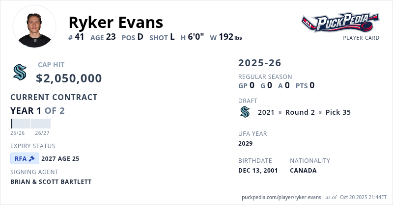 Ryker Evans is signed to a 2 year, $4,100,000 contract with a cap hit of $2,050,000 per season, playing for the Seattle Kraken. His contract expires at the end of the 2026-27 season, making Evans a Restricted Free Agent.