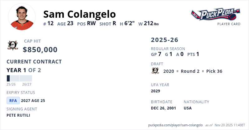 Sam Colangelo is signed to a 2 year, $1,700,000 contract with a cap hit of $850,000 per season, playing for the Anaheim Ducks. His contract expires at the end of the 2026-27 season, making Colangelo a Restricted Free Agent.