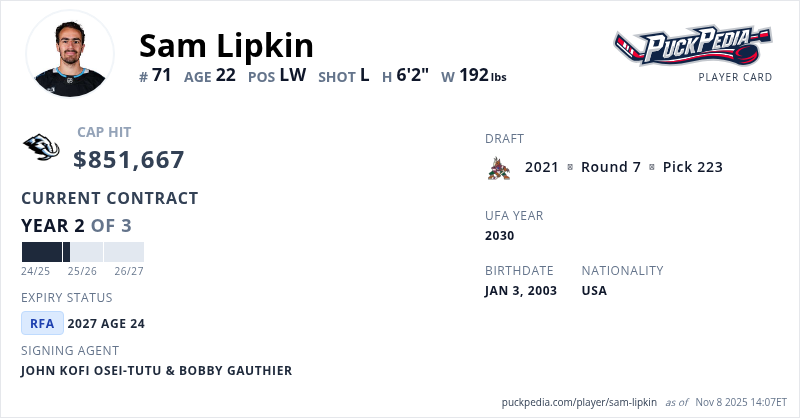 Sam Lipkin is signed to a 3 year, $2,555,001 contract with a cap hit of $851,667 per season, playing for the Utah Mammoth. His contract expires at the end of the 2026-27 season, making Lipkin a Restricted Free Agent.